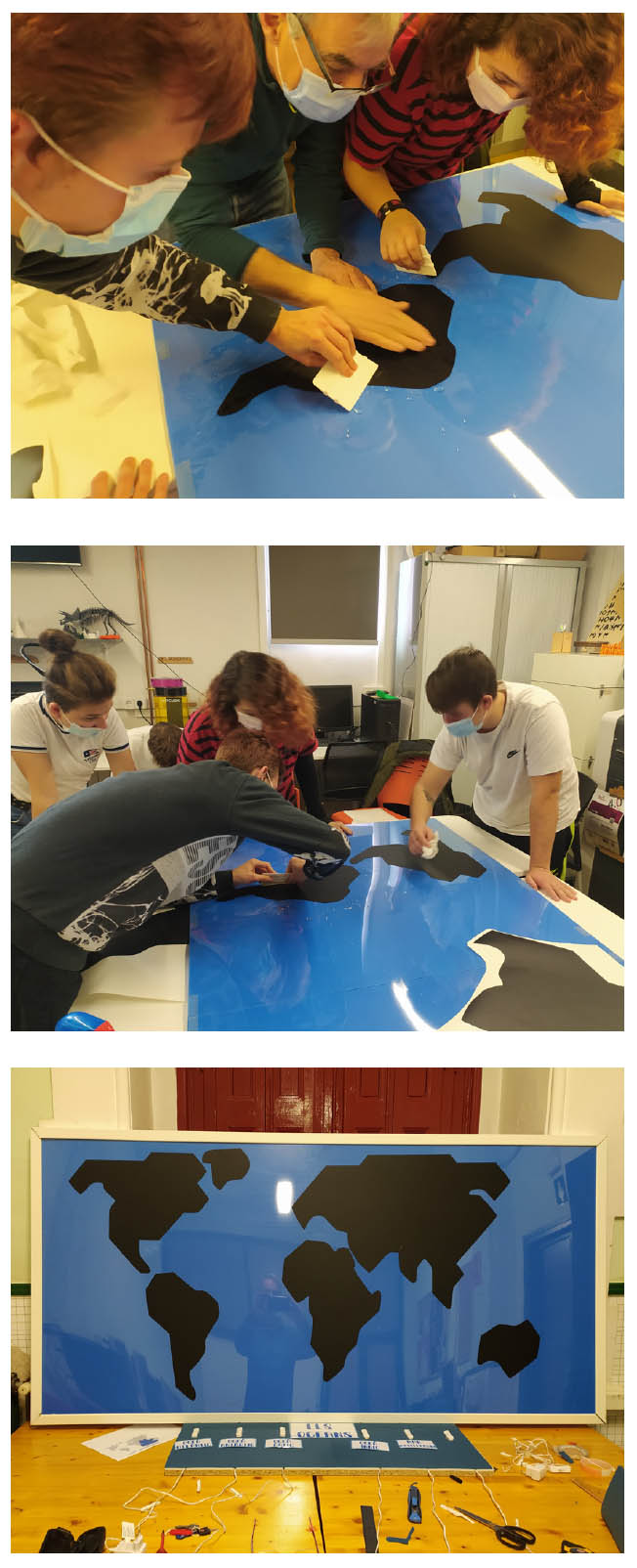 Van aprendre com funcionen les impressores 3D, com es fan els vinils i van aprofitar per fer un plafó per Carnestoltes amb el mapamundi per identificar amb a l’ajuda de llums led els oceans del món.